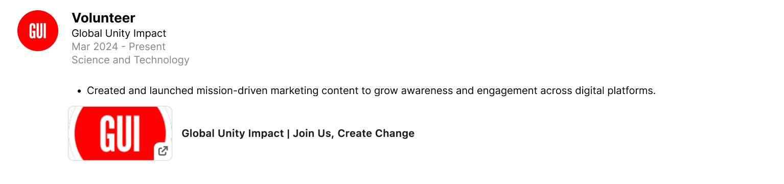 Every action you take with Global Unity Impact moves the world forward — and moves your career forward too. Showcase your impact proudly on LinkedIn, your resume, and your portfolio.
